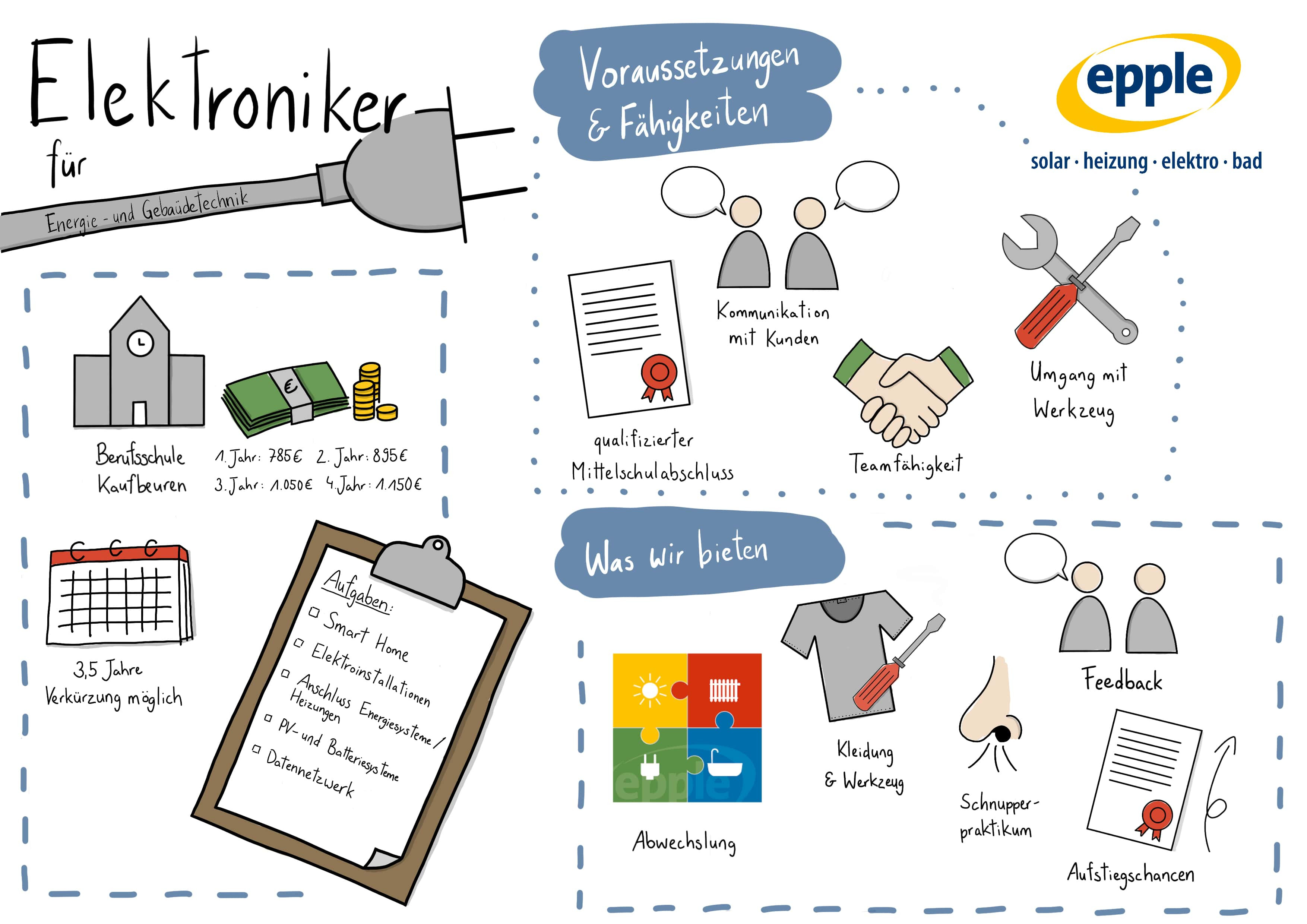 Gestalte Deine Zukunft - mit Spannung! In diesem Beruf erlebst Du jeden Tag spannende Aufgaben, denn dein Arbeitsfeld ist sehr vielseitig. Bei Epple GmbH managst Du als Elektroniker/in für Energie- und Gebäudetechnik ganze Gebäude! Dabei kümmerst Du dich zum Beispiel um Photovoltaikanlagen (PV), Schalt-, Verteilanlagen und Netze. Aber auch elektrische Wärmepumpen gehören zu deinem Fachgebiet. Auch Schutzmaßnahmen sind Dein tägliches Brot.